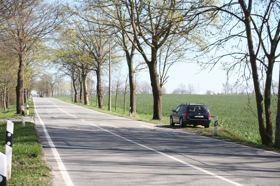 Die Fläche auf der der Messwagen der Stadt Greifswald parkt, wurde extra für die Messungen angelegt. Erlaubt sind an dieser Stelle maximal 50 km/h. Am linken Bildrand ist das gelbe Ortsausgangsschild zu erkennen.