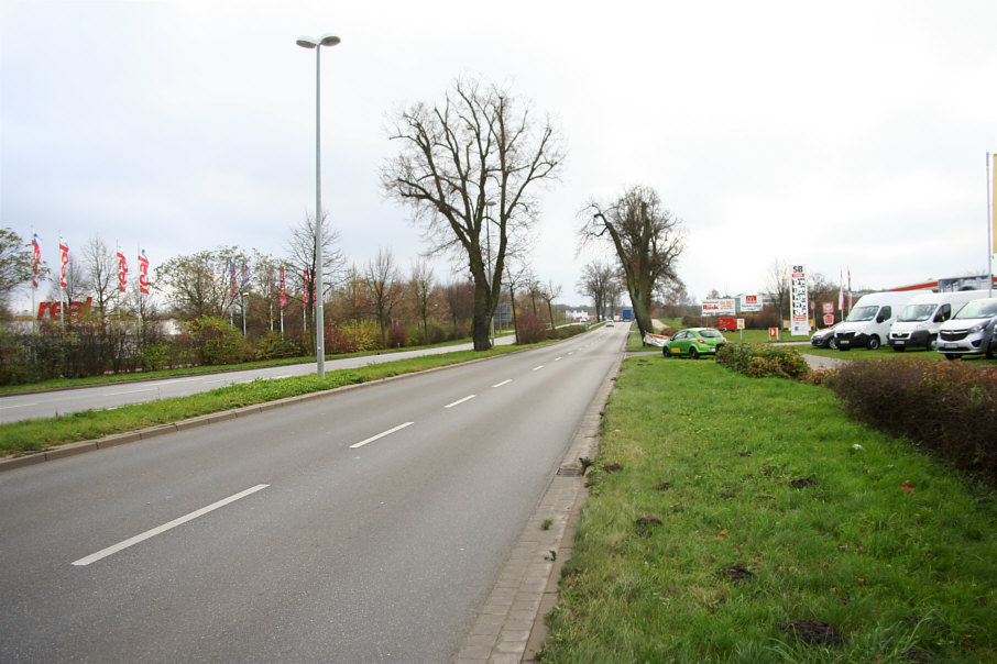 Messung vom 26. November 2014. Überblick über den Mess- und Fotobereich einer Geschwindigkeitskontrolle des Landkreises Mecklenburgische Seenplatte in der Stadt Neubrandenburg auf der Neustrelitzer Straße in Fahrtrichtung stadtauswärts in Höhe der Tankstelle SB Tank kurz nach der Abfahrt zum Einkaufspark Bethaniencenter.
