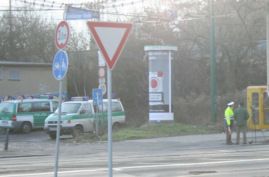 Messung vom 14. Januar 2008. Anfahrt auf eine Geschwindigkeitskontrolle der Polizei des Landes Sachsen-Anhalt in Halle in der Delitzscher Straße in Fahrtrichtung stadtauswärts kurz vor der Kreuzung Landsberger Straße.