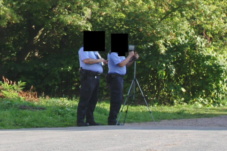 Blick aus der Gegenrichtung auf das Messgerät von Jenoptik. Sehr motiviert sahen die zwei Polizisten während der drei Durchfahrten nicht aus.