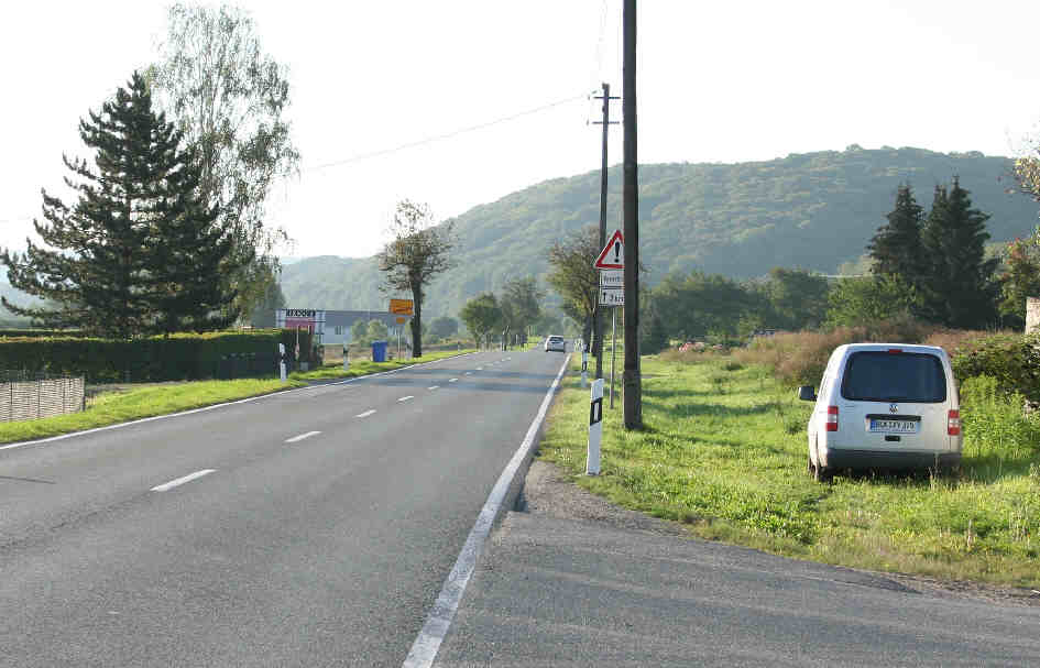 Hier ist der Standort kurz vor dem Ortsausgangsschild noch besser zu erkennen. Da hilft es auch nicht, dass das verwendete Lasermessgerät vom Typ Leivtec XV 2 (Leica XV 2) der Firma Leivtec aus Wetzlar die Messung bereits etwa 30 Meter vor dem Standort des Messfahrzeuges abgeschlossen hat.