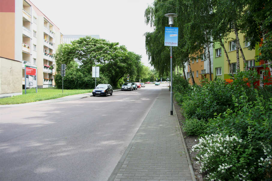 Messung vom 28. Mai 2009. Blick auf den Anfahrtsweg zu einer Geschwindigkeitskontrolle der Stadtverwaltung Merseburg in Merseburg in der Straße Am Brühl in Fahrtrichtung Naumburger Straße (B 181).