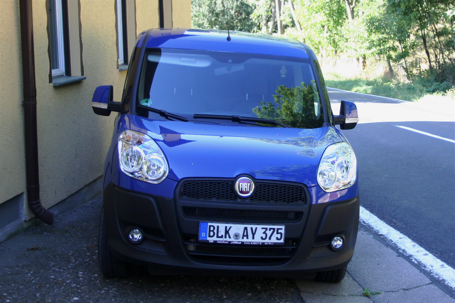 Blick auf die Fahrzeugfront des Messfahrzeuges (Kennzeichen BLK-AY 375). Vermutlich wurde mit dem Lasermessgerät der Firma Leivtec vom Typ XV 2 aus der Frontscheibe heraus gemessen. Zum Zeitpunkt der Aufnahmen war das Gerät aus dem Sichtbereich entfernt worden.