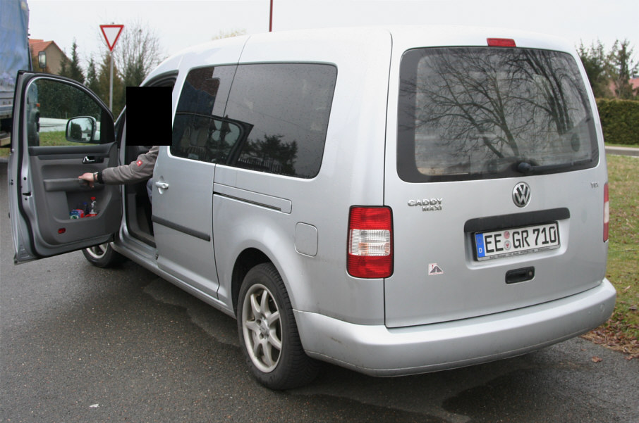 Der zur Testmessung dazugehörige silberne Messwagen (VW Caddy) der Firma German Radar aus Crivitz hatte das Kennzeichen EE-GR 710.