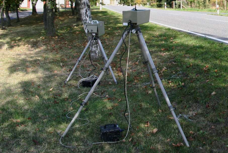 Blick von hinten auf die Kamera. Um die Kamera auf der vom Messfahrzeug abgewandten Seite aufstellen zu können, kam ein WLANkamera zum Einsatz. Da diese keine beweisfähigen Fotos liefer kann, für die Geschwindigkeit, muss gleichzeitig die Kamera für die Gegenrichtung ausgelöst werden.