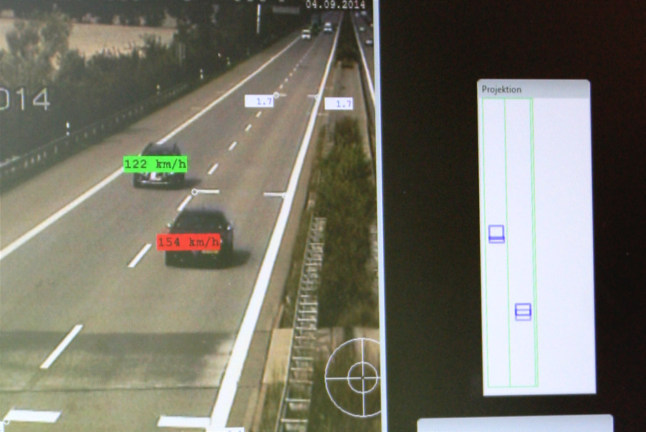 Noch einmal ein Beispiel mit zwei Pkw. Der Pkw auf der Überholspur hat die zulässige Höchstgeschwindigkeit überschritten, so dass die festgestellte Geschwindigkeit rot hinterlegt ist. Mit dem VKS können auch diese Verstöße festgestellt, aufgezeichnet und sodann geahndet werden.