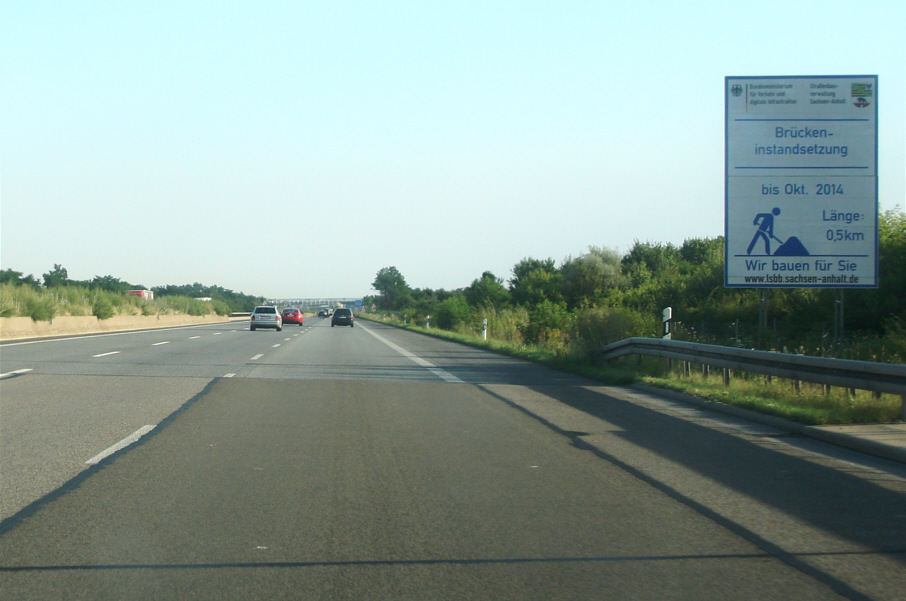 Messung vom 17. Juli 2014. Anfahrt auf die Messstelle der Polizei auf der Autobahn 9 (A9) zwischen Dessau Süd und Bitterfeld-Wolfen an der Brückenbaustelle bei Kilometer 91,2 in Fahrtrichtung Leipzig, München.