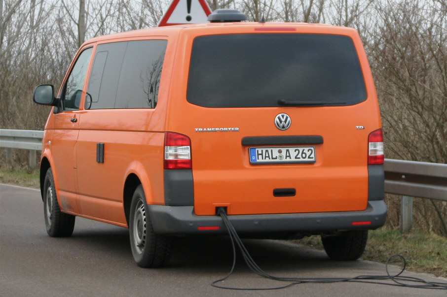 Der orange VW Transporter mit dem Kennzeichen HAL-A 262 stand etwas abseits von der Brücke entfernt. Das Messfahrzeug ist über zahlreiche Kabel mit den Kameras verbunden.
