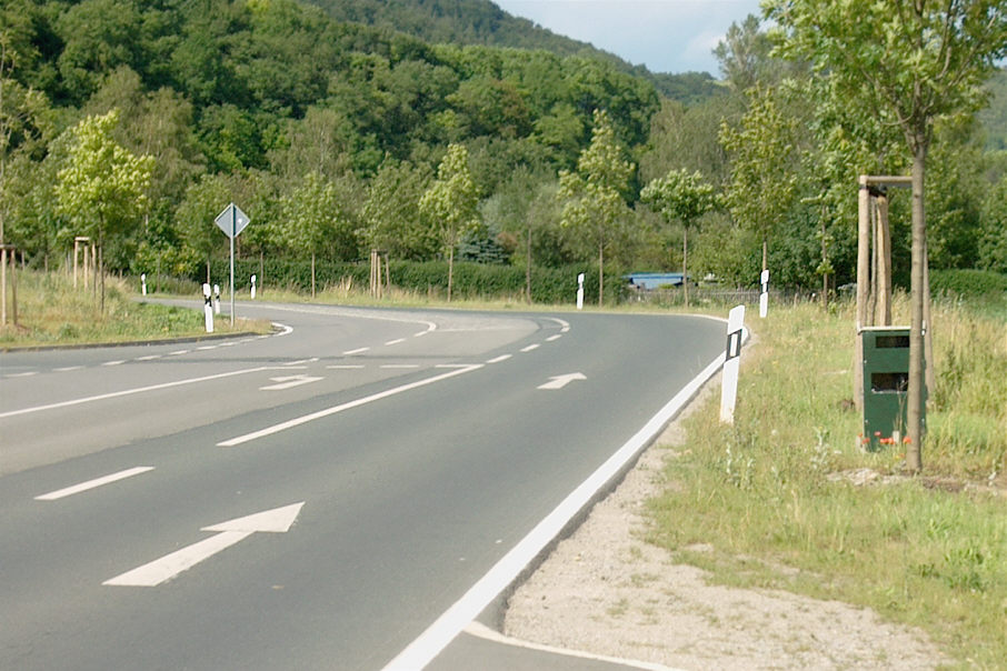 Überblick über den Mess- und Fotobereich des verwendeten Radargerätes. Hinter der im Hintergrund befindlichen Kurve befindet sich das Ortsausgangsschild.
