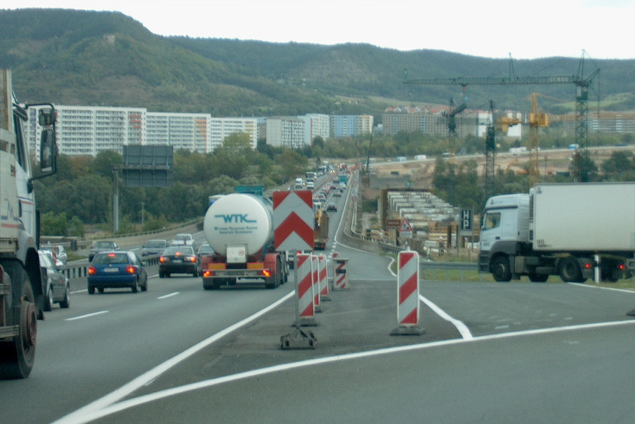 ist eine Geschwindigkeitskontrolle an der Anschlussstelle Jena-Göschwitz in Fahrtrichtung Dresden, Chemnitz. Im Hintergrund sind noch die Bauarbeiten für die