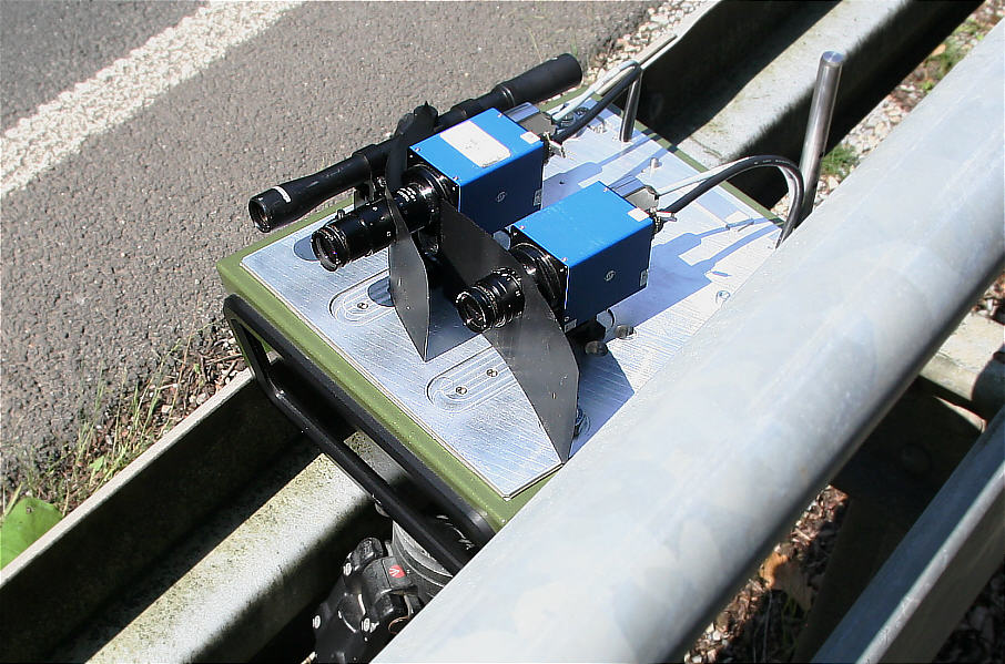 Als Messsystem kam durch die Stadt ein Lidargerät vom Typ PoliScanSpeed (PSS) der Firma Vitronic aus Wiesbaden zum Einsatz. Im Bild zu sehen ist ein Blick auf die zwei Kameras zur Fahreridentifizierung, wobei das PSS selbsttätig entscheidet welche der beiden Kameras das Fahrerfoto aufnimmt. Das Fernrohr dient der optimalen Einrichtung/Aufstellung des Messgerätes.